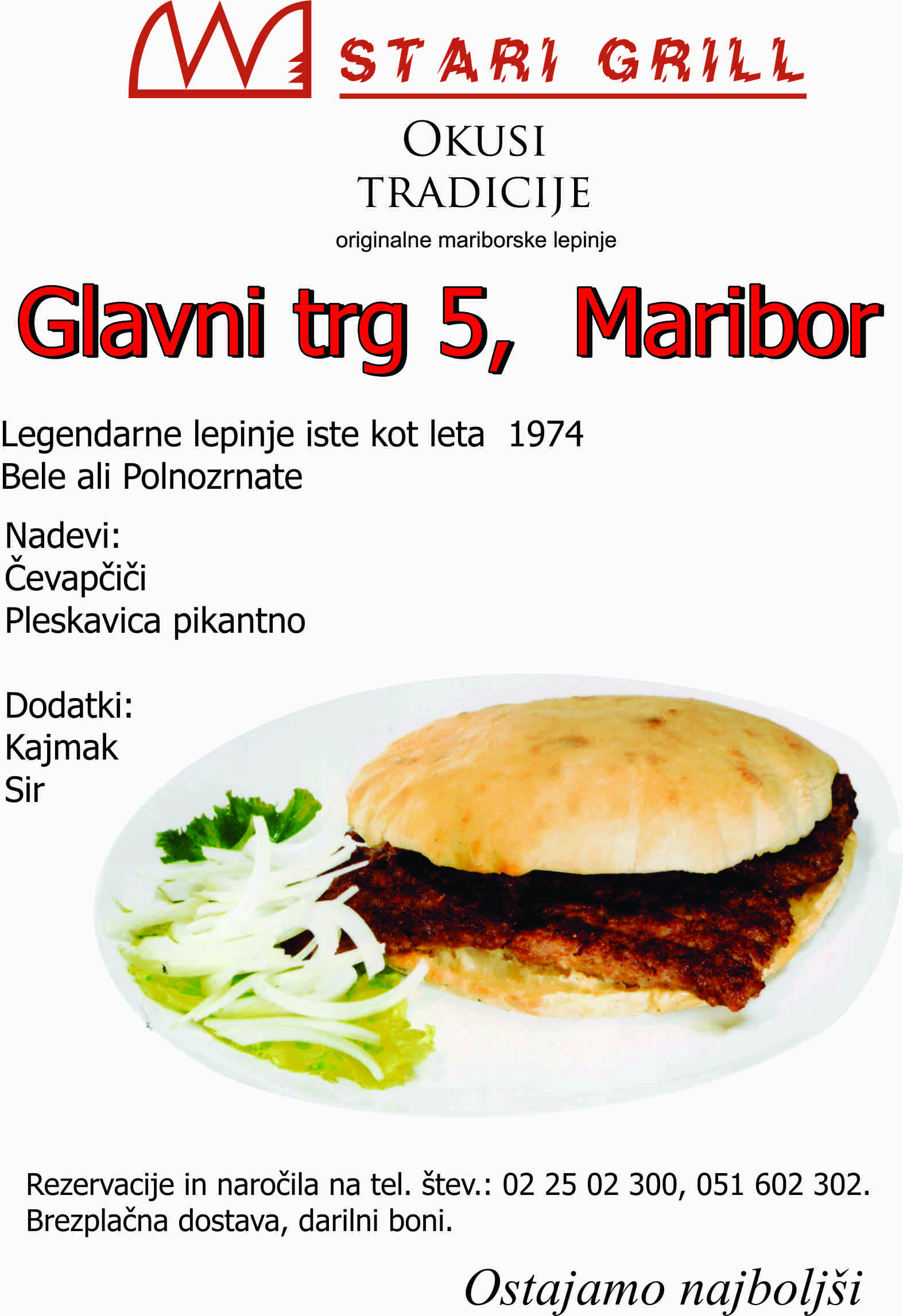Stari gril nudi sveže pripravljene dnevno jedi na žaru. Zorjeni steaki, gurmanske pleskavice, kaki solatni krožnik ter seveda dobro poznane lepinje: bele ali polnozrnate.